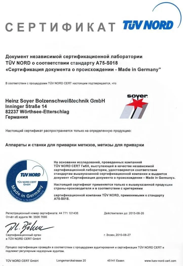 SOYER имеет сертификат TUV-Nord, а также право наносить на корпус своих аппаратов флаг Германии и четкую надпись made in Germany, в то время как у других производителей нет такого преимущества по причине того, что они используют не только немецкие запчасти и компоненты.