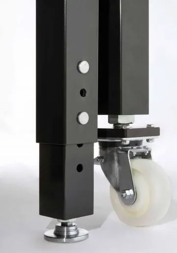 5. Опора с роликом, регулируемая по высоте – регулировка высоты от 550 до 750 мм. Превращает универсальный сварочный стол в мобильную производственную единицу. Сочетает роликовый механизм со стопором и телескопическую систему регулировки высоты. Тонкая регулировка высоты до 20 мм.