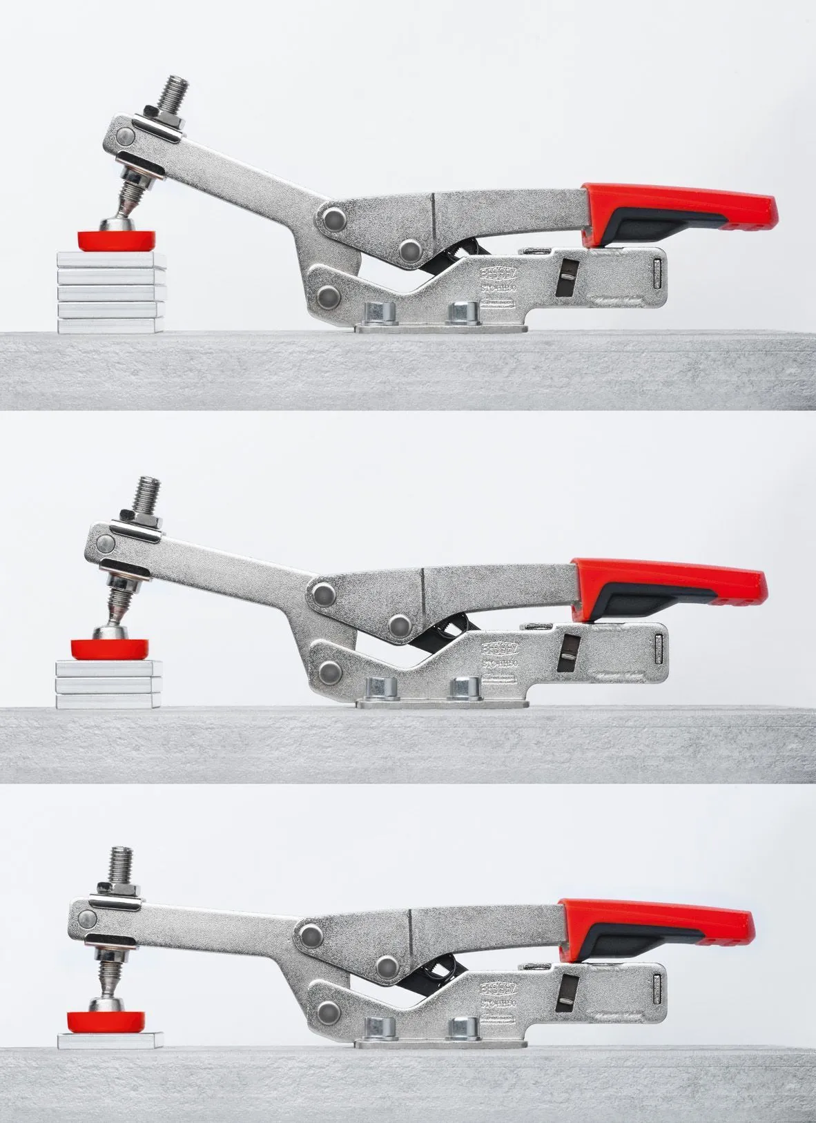 | Характеристики | Перемещение рычага преобразуется в продольное движение упора Автоматическая плавная подстройка хода прижима до 13 мм при сохранении зажимного усилия почти на одном уровне без ручной регулировки прижимного винта Настройка зажимного усилия до 2500 Н с помощью установочного винта на шарнире Прочная конструкция из улучшенного металла для большого срока службы Рисунок отверстий в основании подходит для метрической и дюймовой системы Высококачественая двухкомпонентная пластиковая рукоятка, маслостойкая |