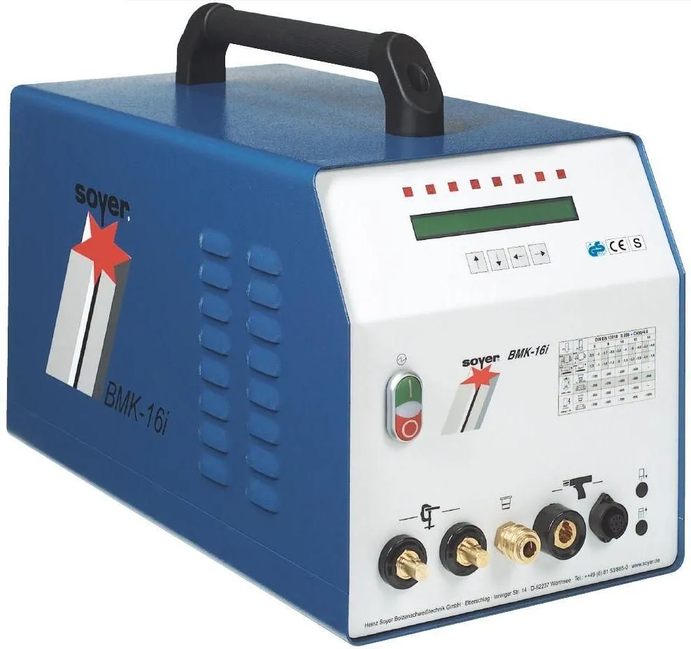 BMK-16i – самый современный и многофункциональный блок для приварки крепежа. В данный аппарат включены следующие технологии: Приварка вытянутой дугой ARC, Приварка коротким циклом SC, приварка метизов электрической дугой в радиально-симметричном магнитном поле (SRM), что позволяет приваривать нержавеющие гайки, электродная сварка ММA и TIG- сварка, что избавляет от необходимости приобретать отдельные блоки для различных задач. Для работы необходимо подключение электричества 380 Вольт и использование защитного газа или керамических колец.