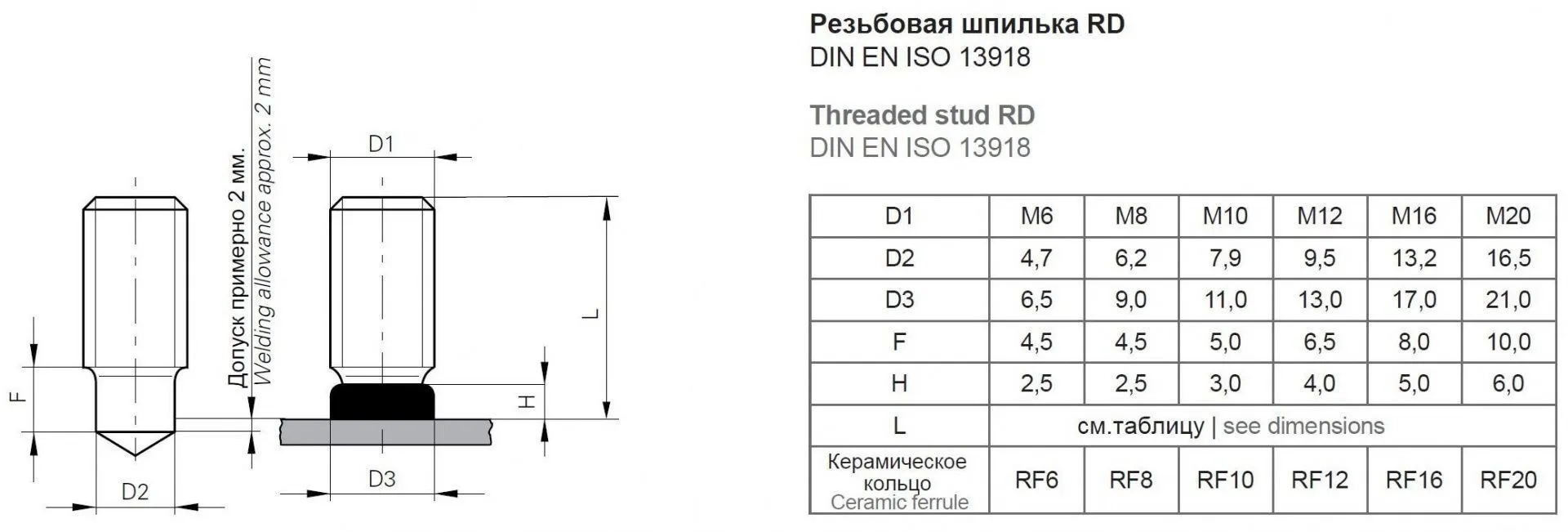 Шпильки типа RD изготавливаются с резьбой по всей длине стержня, что обеспечивает надежное крепление деталей и возможность регулировки положения соединяемых элементов. Приварка осуществляется путем сварки короткой дугой, что гарантирует прочность соединения и долговечность конструкции.