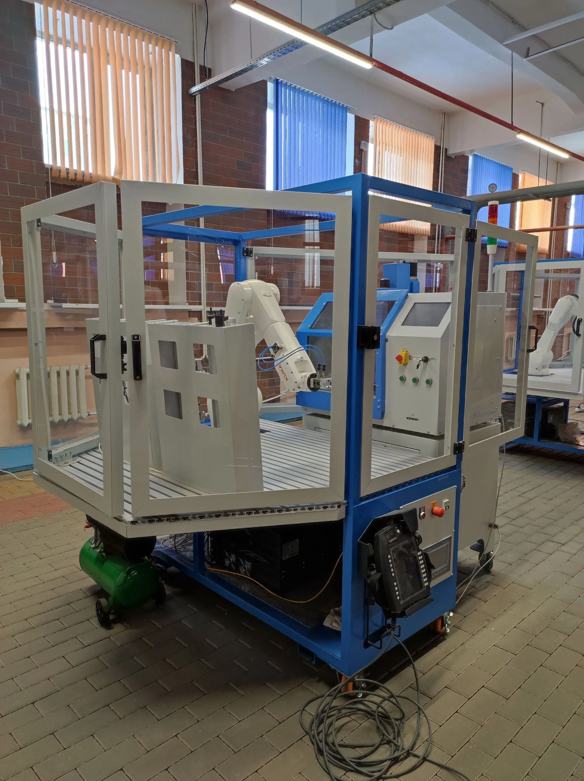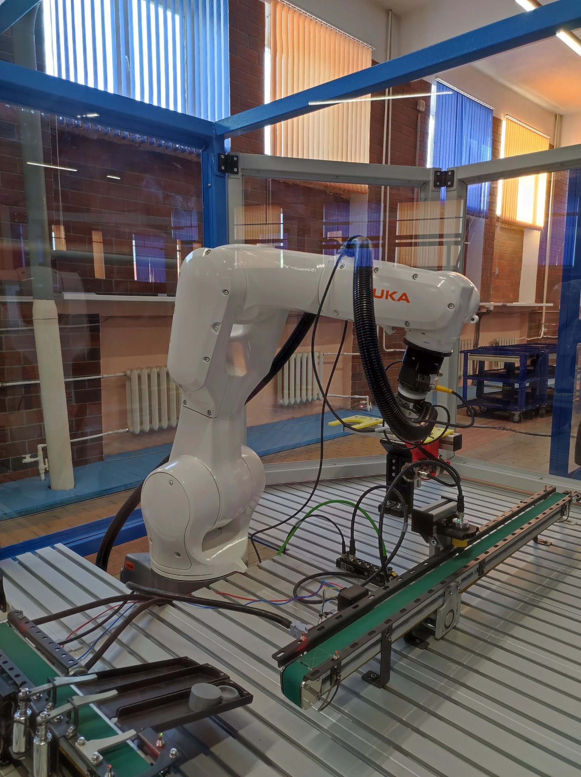 - роботизированная ячейка по работе с автоматическими линиями, технологический комплекс по изучению работы с внешними системами управления и работе с периферийным оборудованием - конвейеры, пневматические захваты, система автоматической смены инструментов, и система RFID;