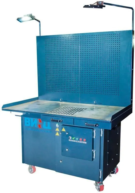 Стол представляет собой эргономичное рабочее место со столешницей и задней перфорированной панелью. Столешница установлена на фильтровально-вытяжным модуле. Загрязненный воздух отводится непосредственно в модуль, где очищается от механических примесей. Очищенный воздух подается обратно в помещение. Фильтровально-вытяжной модуль оснащен встроенным вентилятором с регулировкой оборотов, патронным фильтр-элементом с автоматической системой регенерации. Плавная регулировка оборотов вентилятора в сочетании с системой задвижек позволяют настроить отвод воздуха под любые виды сварочных работ в т.ч. в газовой смеси.