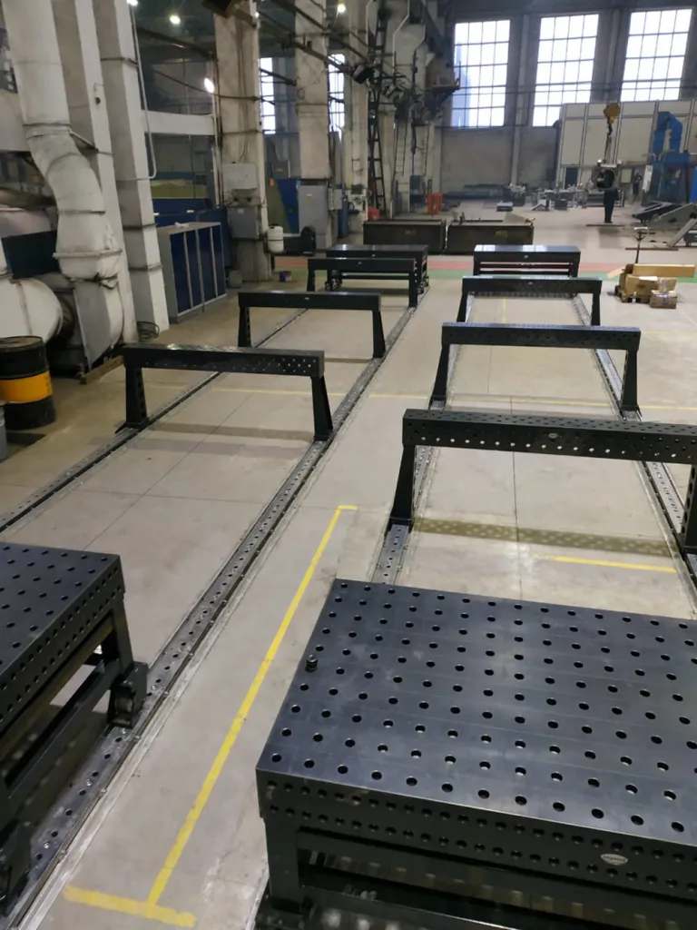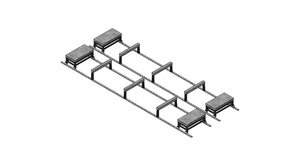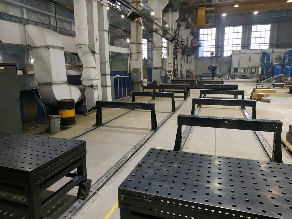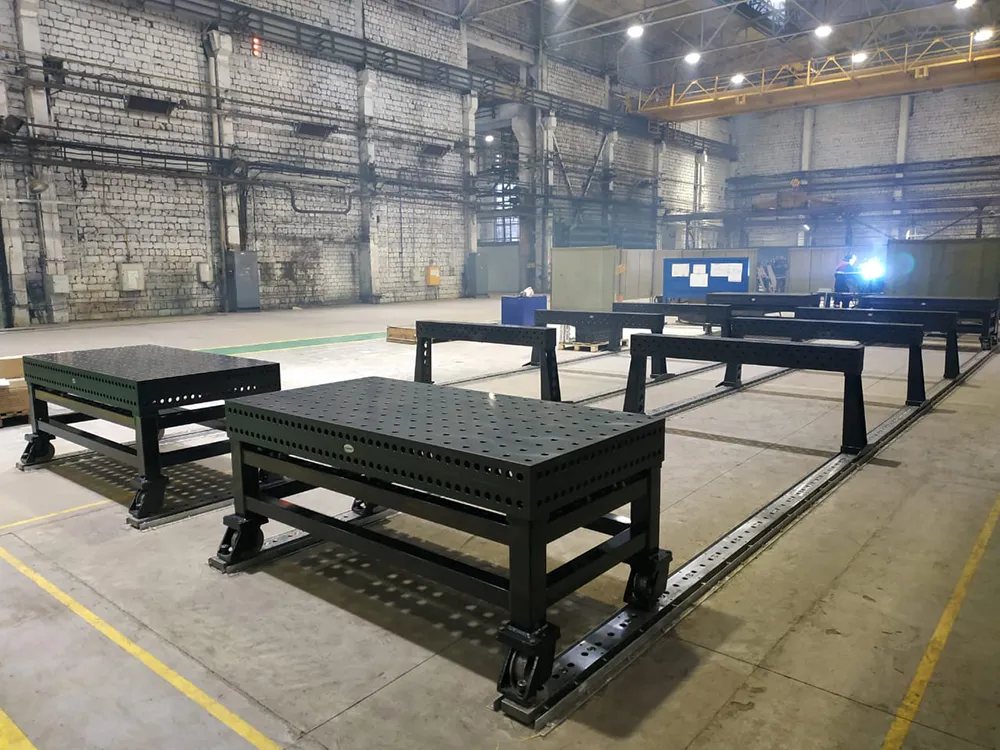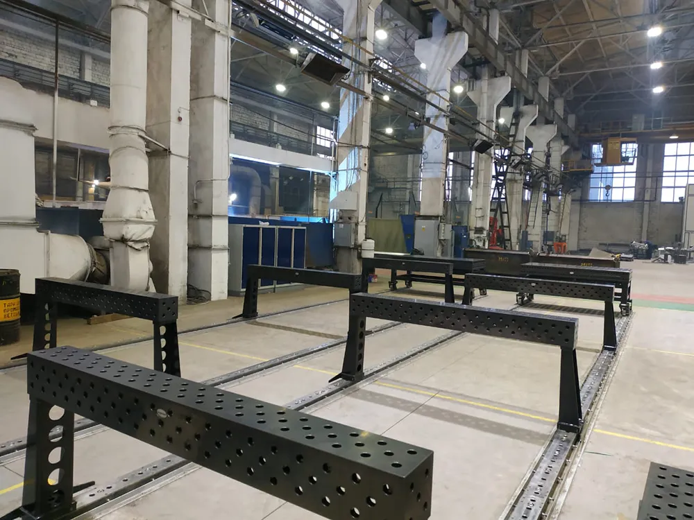 Рельсовая система для сборки стрел кранов применяется как универсальное место для изготовления широкой номенклатуры стрел заказчика применяемые в многочисленных моделях колесных и гусеничных кранов. Система состоит из 2 путей по 14 метров на которых расположены столы (2 на каждом пути) и блоки (5 блоков на каждом пути), а также комплект элементов оснастки.