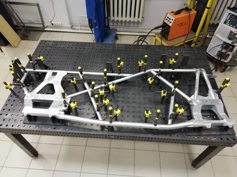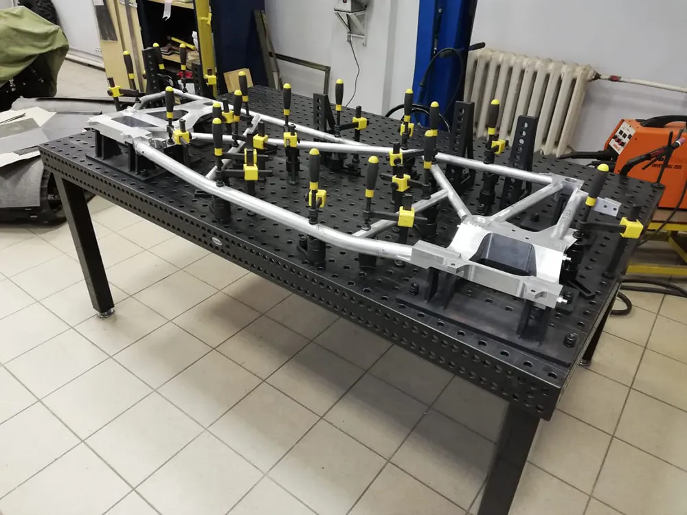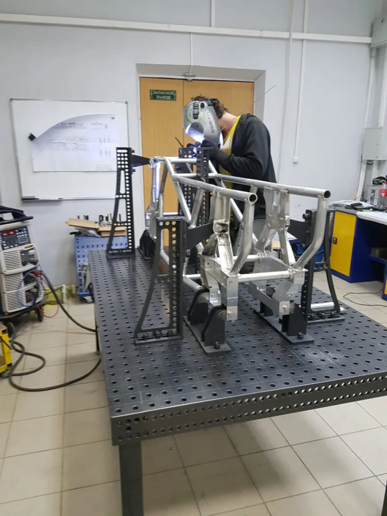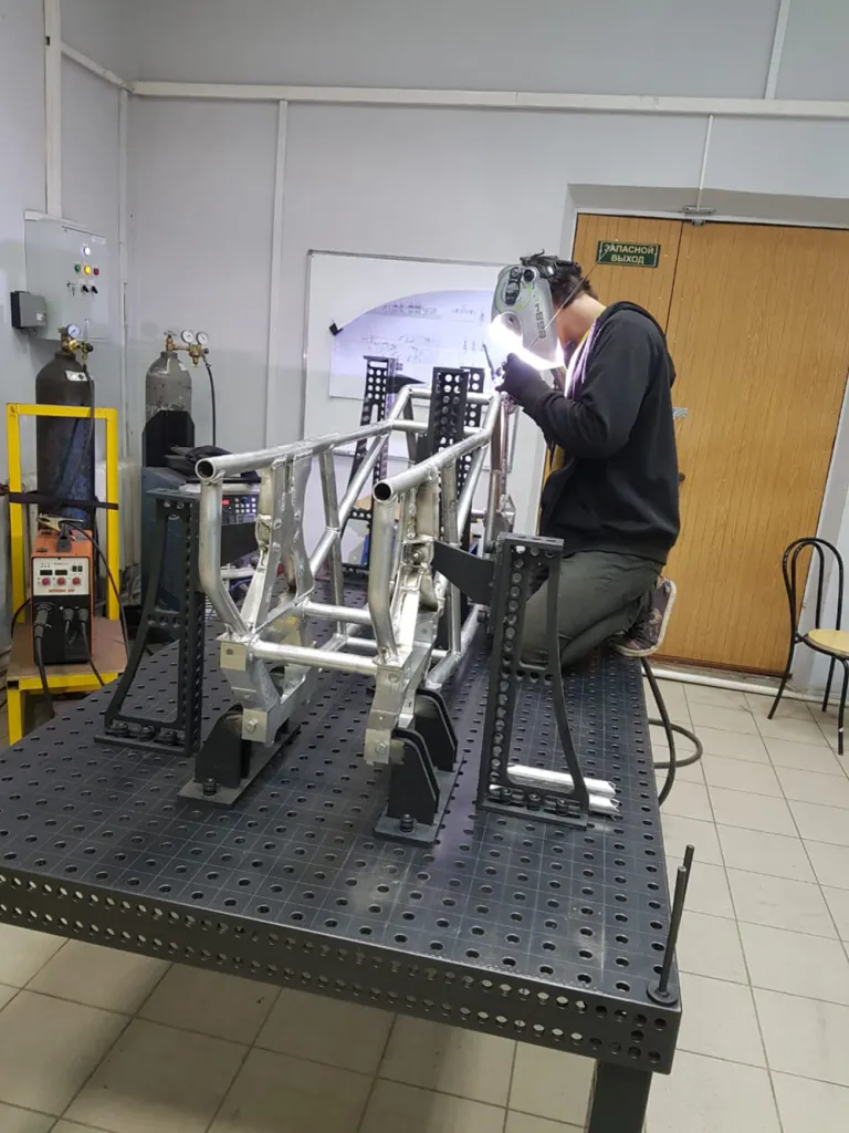 На сборочно-сварочном столе 16 системы собирается несущая система (рама) и подвеска экспериментального мотовездехода (квадроцикла).